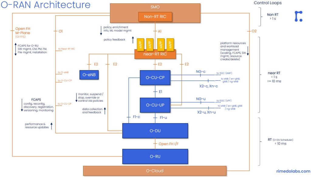As before, the “blue” entities are specified by the 3GPP (both including functionality provided by blue boxes as well as interfaces, like F1 and E1), while “orange” elements and interfaces are specified by O-RAN Alliance. Let’s now focus on the “orange” interfaces: