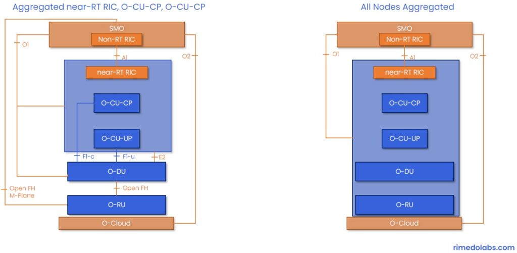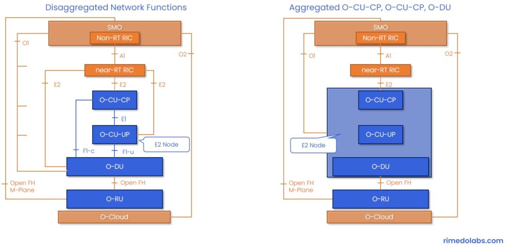 This post discusses the nodes and interfaces defined by O-RAN Alliance. The provided implementation options visualize one of the benefits of O-RAN, namely the implementation flexibility with the open O-RAN architecture. Those options from one side provide the flexibility in implementation and various vendor configurations, but the price to pay for this variety is that you need a way to identify the internal nodes, that you want to control, i.e. it requires the E2 interface and O1 interface to be able to capture all those different options and encapsulate control elements for e.g. O-DU only.