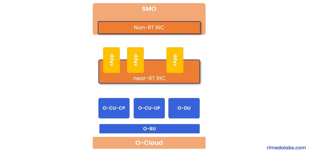 - SMO (Service and Management Orchestration): a system supporting orchestration of O-RAN components that includes NRT RIC.