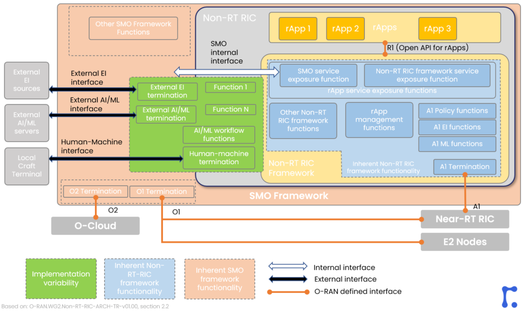 There are also parts in the SMO framework that are out of Non-RT RIC scope, marked with a „pink-ish” color. They are basically related to the O1/O2 termination as well as other SMO framework functions, e.g. for network slicing lifecycle management. Those are inherent to the SMO framework.