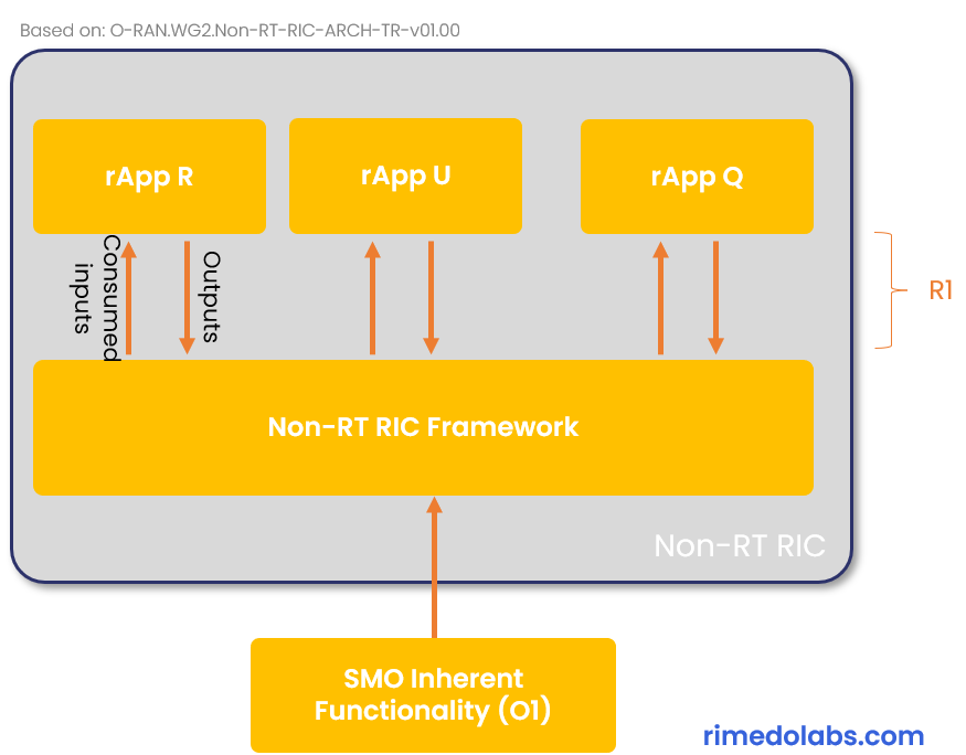 rApps are applications designed to run on Non-RT RIC providing additional value-added services to help creation of policies that the Non-RT RIC framework delivers down to Near-RT RIC through the A1 interface. Fig. 2, shows Non-RT RIC with three example rApps, namely rApp R, rApp U, and rApp Q connected via R1 interface to the Non-RT RIC framework. Their inputs and outputs are as follows: