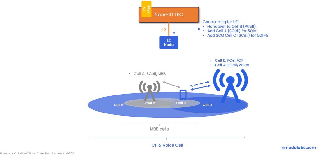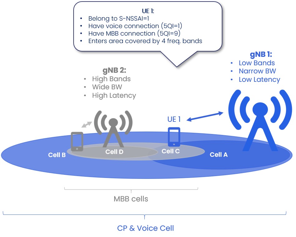 To achieve that behavior, the non-RT RIC sends two policies to near-RT RIC as shown in Fig. 5. One of them steers voice services to be served by cell B (basically saying that for CP we are setting the cell B with „shall” and that it’s a primary cell, whereas we may have for the voice also cell B, and it might be secondary cell), whereas second policy is for MBB service, which states, that UE shall avoid cell B and A, (because it would consume a lot of resources, required by CP traffic and voice users), and it should prefer cells C and D (which are dedicated for MBB).