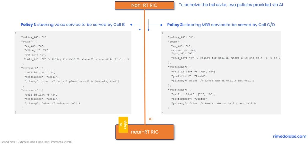 Cells C/D are treated as MBB cells, while for the voice service, we don’t need that much BW and we rather focus on high coverage, to avoid frequent handovers and providing a reliable connection. The UE under consideration is having two services, voice and MBB (belonging to slice ID 1). The UE is entering the area covered by the four cells mentioned above. If we now look at the situation from the O-RAN perspective, the Non-RT RIC understands the requirements and characteristics of that services. It decides that due to having a voice and Control Plane (CP) connection, we need to put those on a low band (basing its decisions on measurements, or ML algorithm, or operator settings) on the largest cell, which will be cell B. On contrary, for MBB connection when the user moves to the coverage of small cells, we can add a second transmission leg and offload this traffic type to cell C/D, and try to avoid consuming resources from the cells A/B. This shall be sent to near-RT RIC, through several policies as described below.