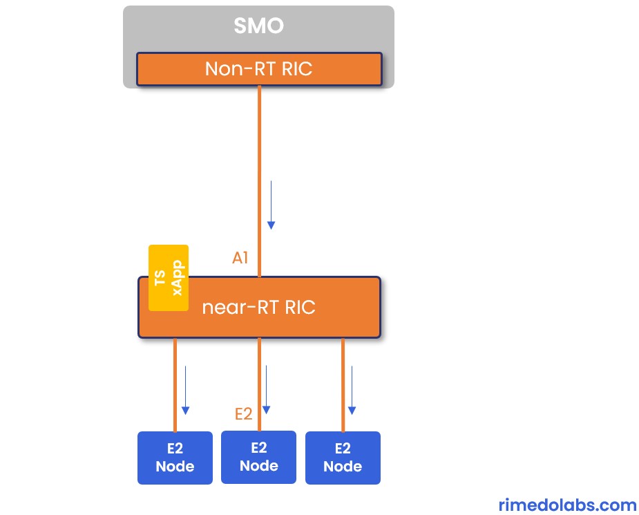 - Defines and updates policies – to guide the behavior of TS xApp in near-RT RIC (e.g. optimization objectives to guide carrier/band preferences for UE/UE-group);