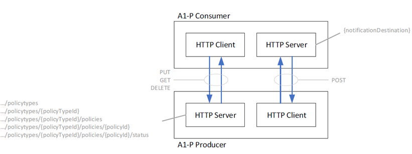 A1-P Consumer is residing in the Non-RT RIC and the A1-P Producer is residing in the Near-RT RIC. Both the A1-P Consumer and the A1-P Producer contain an HTTP Client and an HTTP Server. In the future, A1-ML or A1-EI service models can be necessary when extending xApp with Machine Learning models.
