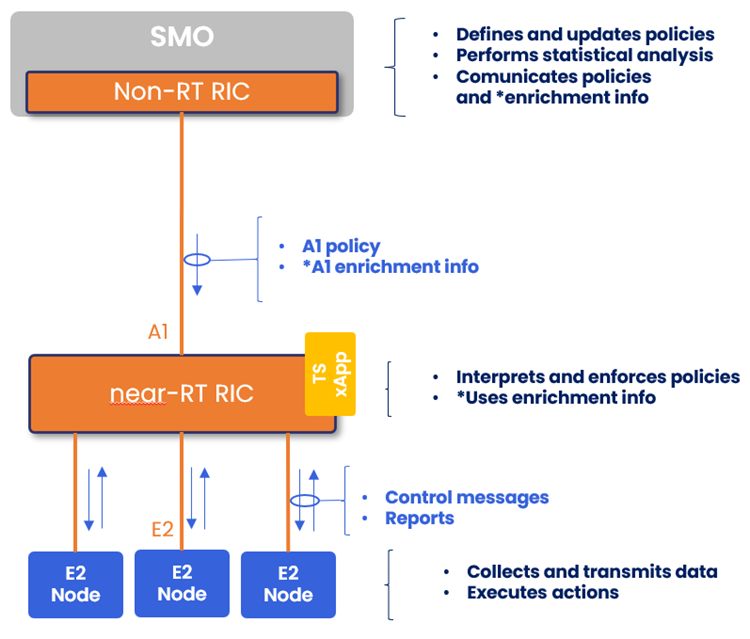 Traffic Steering (TS) application (xApp) for µONOS RIC – associates the users with the eNB/gNB taking into account user radio conditions, cell types, and service type/QoS profile. It can be controlled by policies from non-RT RIC (A1 interface).