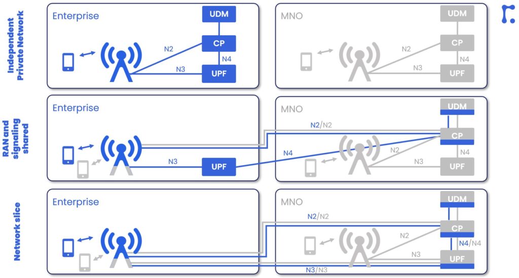 If we use nomenclature from the previous section, the top option (i.e., an independent private network) is SNPN, while the other two options (i.e. RAN and signaling shared, and a Network slice) are versions of PNI-NPN as given below.