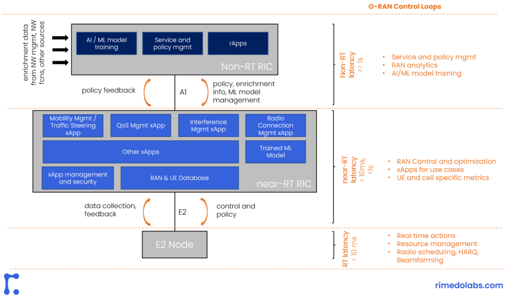 Near-RT RIC in turn is a software platform to allow the xApps to control the RAN through it. It enables near real-time control optimization of the RAN elements (called E2 Nodes) via actions sent over the E2 interface. Example xApps include handover optimization, radio link monitoring, mobility management, load balancing, slicing policy updates, traffic steering, and interference management. E2 interface is a closed loop within the RAN domain, used to send the RIC control and policy towards E2 Nodes and to obtain the feedback from E2 Nodes to the Near-RT RIC.